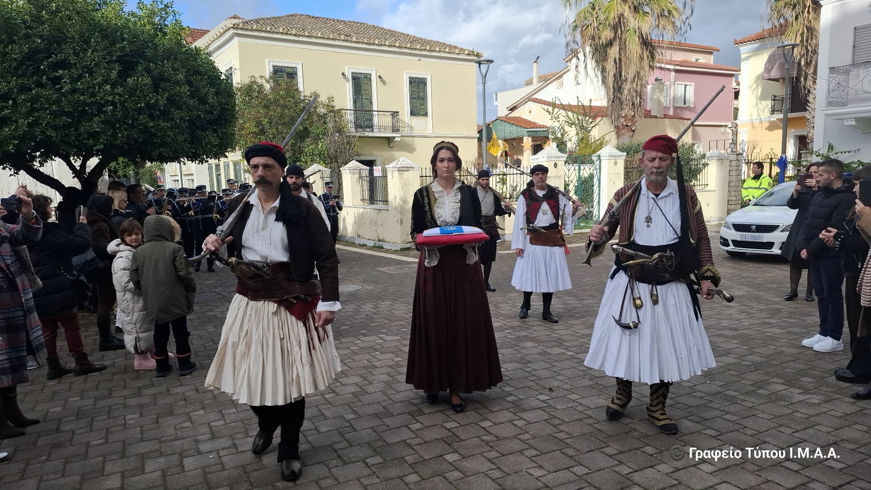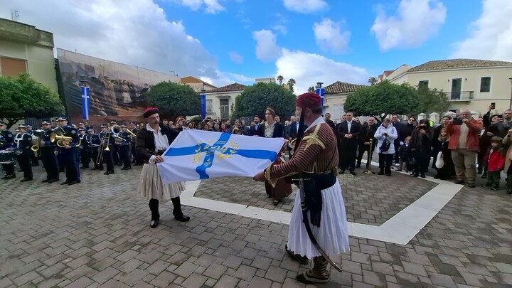 Στη συνέχεια, στον προαύλιο χώρο του Ναού πραγματοποιήθηκε η επίσημη έπαρση της επετειακής σημαίας, παρουσία των τοπικών αρχών και πλήθους πιστών, υπό τους ήχους της Φιλαρμονικής του Δήμου Ιεράς Πόλεως Μεσολογγίου «Διονύσιος Σολωμός».