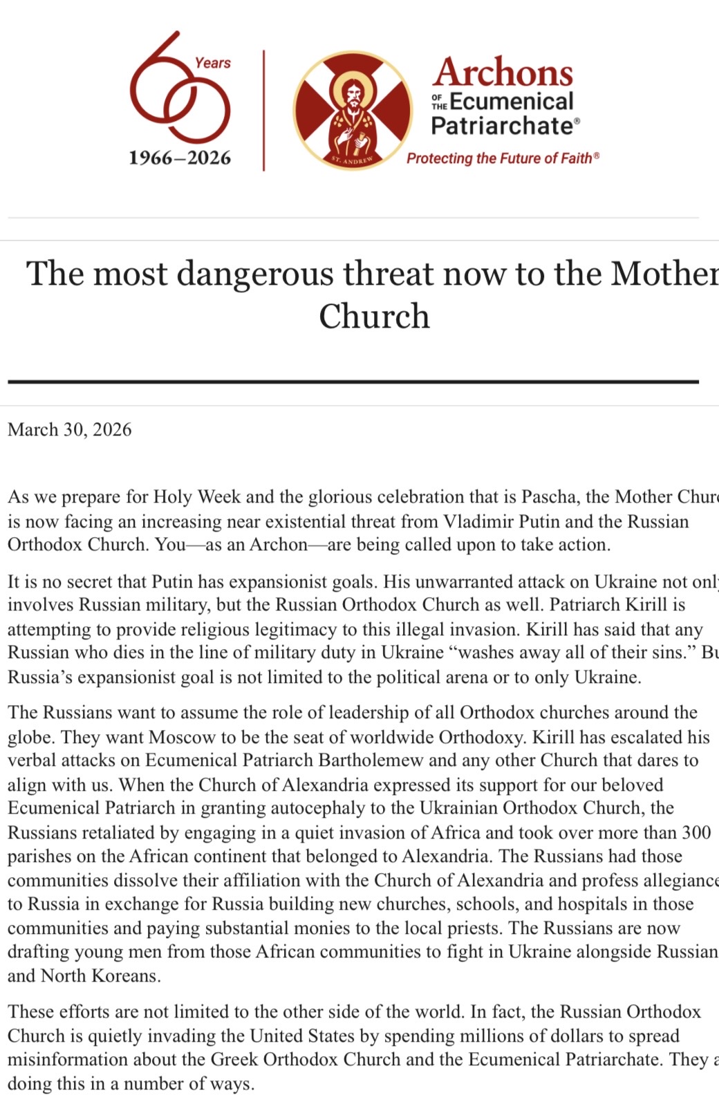 Καθώς προετοιμαζόμαστε για τη Μεγάλη Εβδομάδα και τον ένδοξο εορτασμό του Πάσχα, η Μητέρα Εκκλησία αντιμετωπίζει τώρα μια αυξανόμενη σχεδόν υπαρξιακή απειλή από τον Βλαντιμίρ Πούτιν και την Ρωσική Ορθόδοξη Εκκλησία. Εσείς -ως Άρχων- καλείστε να αναλάβετε δράση.