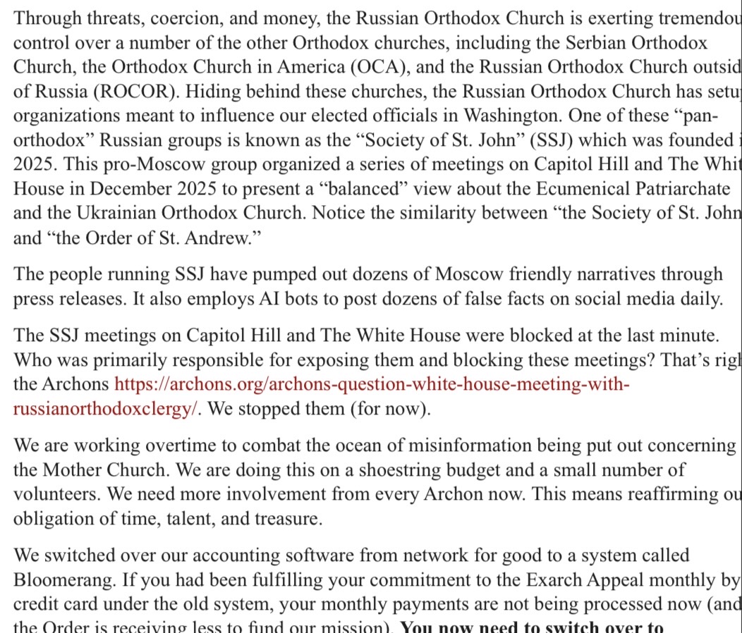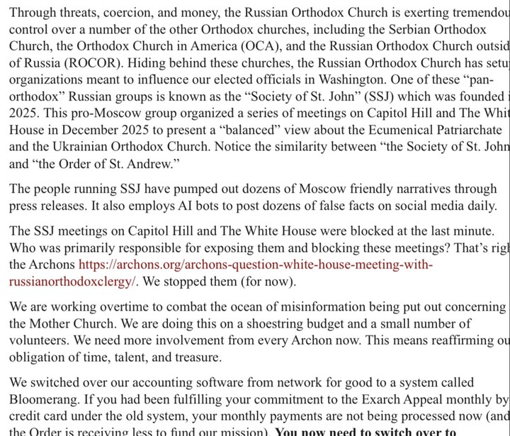 Μία από αυτές τις «πανορθόδοξες» ρωσικές ομάδες είναι γνωστή ως «Εταιρεία του Αγίου Ιωάννη» (SSJ), η οποία ιδρύθηκε το 2025. Αυτή η φιλορωσική ομάδα οργάνωσε μια σειρά συναντήσεων στο Καπιτώλιο και στον Λευκό Οίκο τον Δεκέμβριο του 2025 για να παρουσιάσει μια «ισορροπημένη» άποψη για το Οικουμενικό Πατριαρχείο και την Ουκρανική Ορθόδοξη Εκκλησία. Παρατηρήστε την ομοιότητα μεταξύ «Εταιρείας του Αγίου Ιωάννη» και «του Τάγματος του Αγίου Ανδρέα».