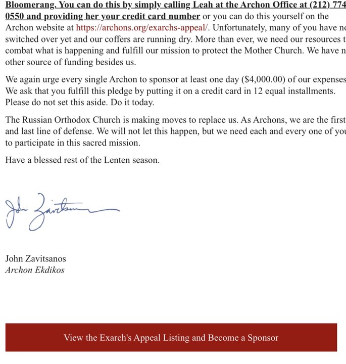 Μπορείτε να το κάνετε αυτό απλώς καλώντας τη Λία στο Γραφείο των Αρχόντων στο (212) 774 – 0550 και δίνοντάς της τον αριθμό της πιστωτικής σας κάρτας ή μπορείτε να το κάνετε μόνοι σας στον ιστότοπο των Αρχόντων στη διεύθυνση https://archons.org/exarchs-appeal/. Δυστυχώς, πολλοί από εσάς δεν έχετε αλλάξει ακόμη και τα ταμεία μας στερεύουν. Περισσότερο από ποτέ, χρειαζόμαστε τους πόρους μας για να καταπολεμήσουμε ό,τι συμβαίνει και να εκπληρώσουμε την αποστολή μας να προστατεύσουμε τη Μητέρα Εκκλησία. Δεν έχουμε άλλη πηγή χρηματοδότησης εκτός από εμάς.