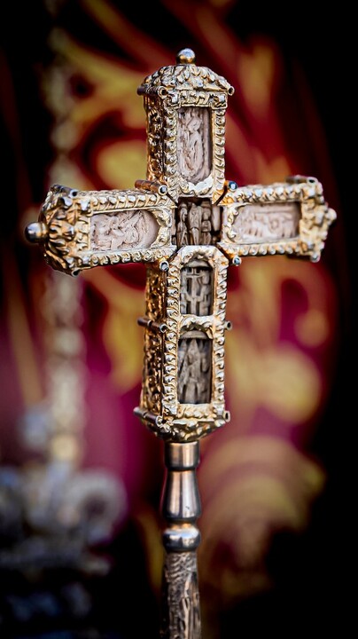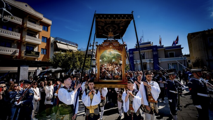 Στη συνέχεια, με λιτανευτική πομπή, μεταφέρθηκαν η Εικόνα της Εξόδου, το Ιερό Λάβαρο, ο Σταυρός Ευλογίας του Επισκόπου Ρωγών και Κοζύλης Ιωσήφ και το καριοφίλι του Στρατηγού Δημητρίου Μακρή, από το Μουσείο Ιστορίας και Τέχνης – Πινακοθήκη, στον Ιερό Μητροπολιτικό Ναό του Αγίου Σπυρίδωνος.