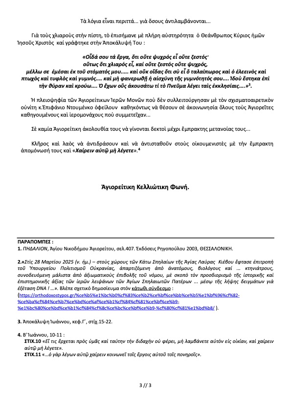 Οι μοναχοί γράφουν ότι η επίσκεψη του Επισκόπου Επιφανίου είναι πνευματική απώλεια: