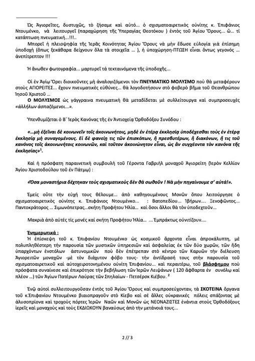 Οι μοναχοί δήλωσαν επίσης ότι ο Επιφάνιος και η αντιπροσωπεία του έφεραν στο Άγιο Όρος «πνευματική μόλυνση», και όσοι τους δέχτηκαν φέρουν πνευματική ευθύνη και θα σταθούν ενώπιον της φοβερής Κρίσης: