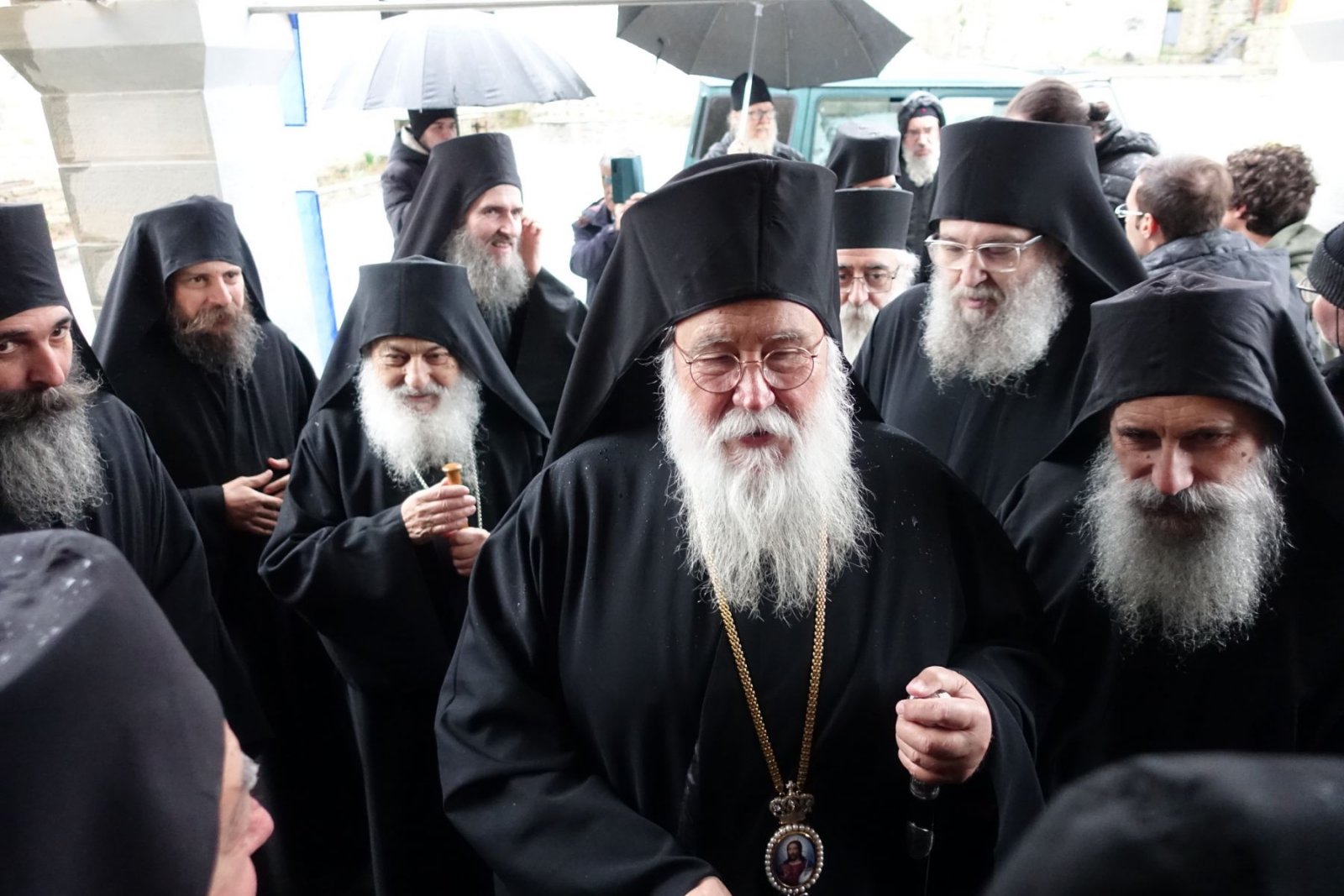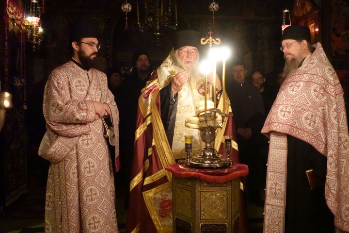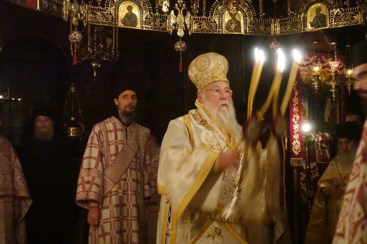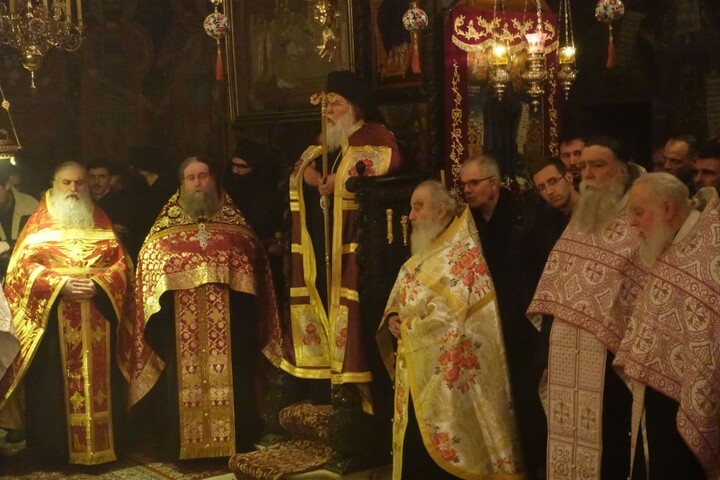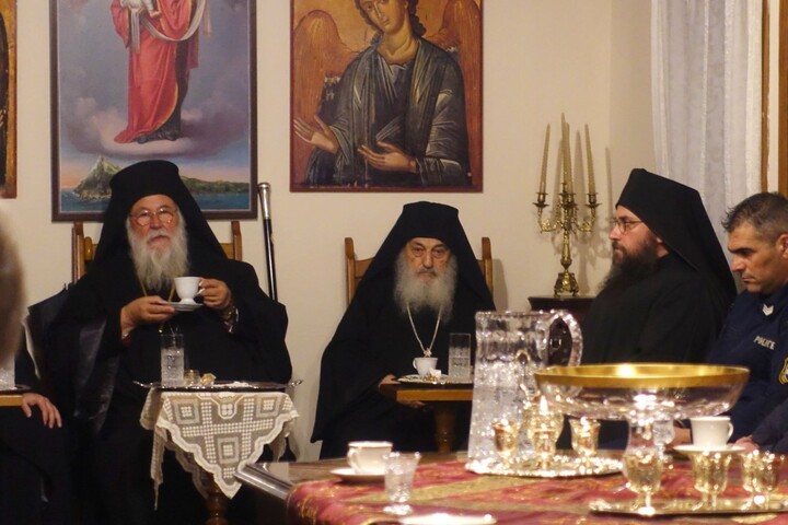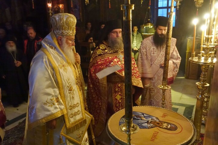 Σε χειμωνιάτικο σκηνικό υπεδέχθη στα προπύλαια της Ι. Μ. το Σεβασμιώτατο ο Πανοσιολογιώτατος Καθηγούμενος Αρχιμανδρίτης Φιλόθεος μετά της εκλεκτής αδελφότητος της Ι. Μ.. Κατευθυνόμενοι στο καθολικό της Ι. Μ. και μετά την προσκύνηση και την υποδοχή, κατευθύνθηκαν στο συνοδικό όπου προσεφέρθη το μοναστηριακόν κέρασμα. Ειρήσθω δε ότι η αγρυπνία άρχισε περί την 7η εσπερινήν και σε συνεχόμενη προσευχή – ακολουθία τελείωσε στις 8 και μισή πρωινή η Θεία Λειτουργία.