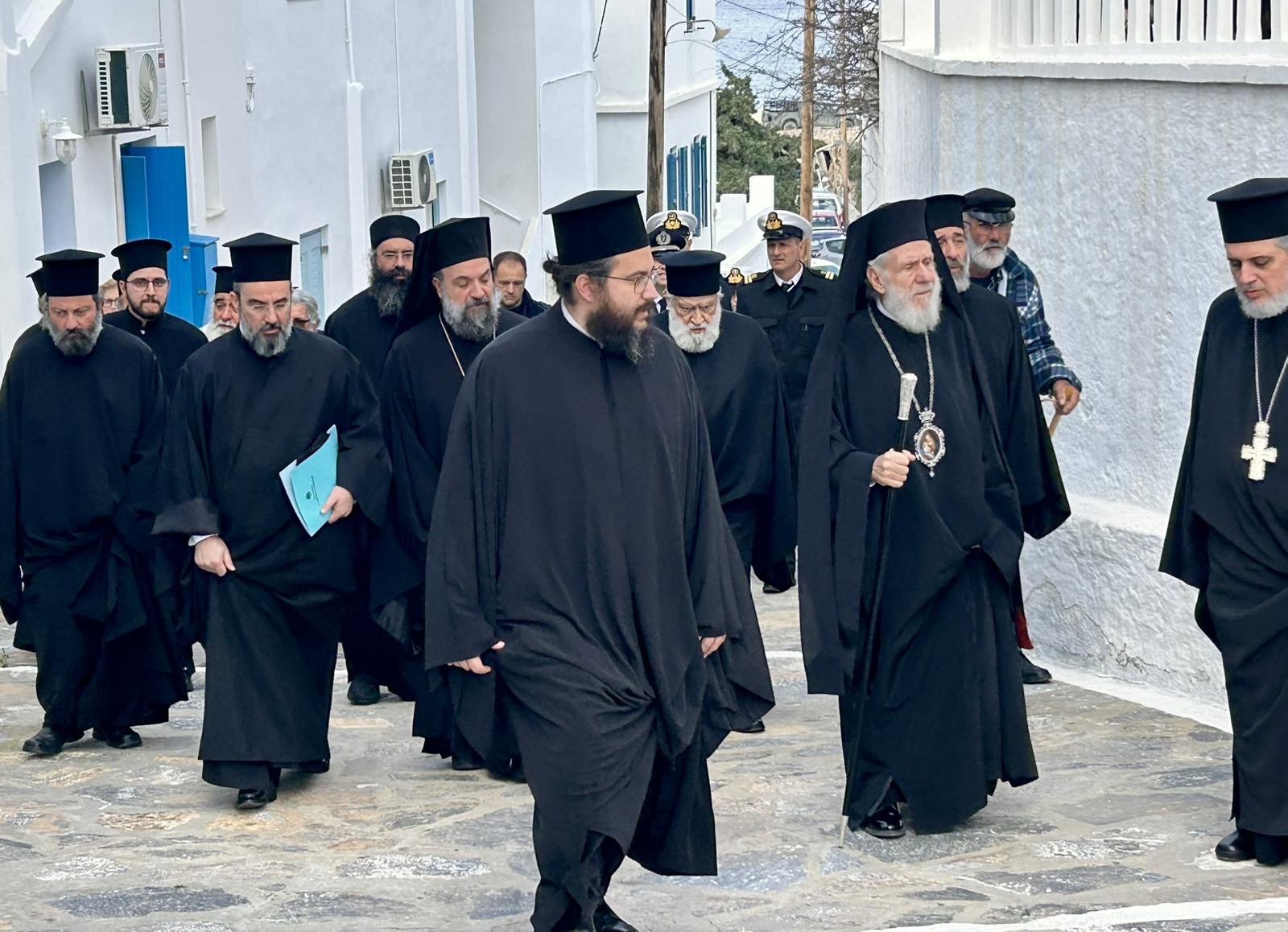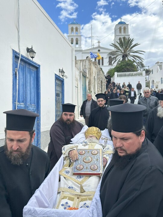 Πλήθος πιστών από τα εννέα νησιά που διεποίμανε ο αοίδιμος Ιεράρχης, ο Θηραίος Βουλευτής Κυκλάδων κ. Μάρκος Καφούρος, τοπικές αρχές και κλήρος της Σαντορίνης, της Αμοργού, της Θηρασίας, της Ίου, της Ανάφης, της Σχοινούσας, της Δονούσας, της Ηρακλειάς και των Κουφονησίων ως και οι Αμοργίνοι Αιδεσιμολογιώτατος Πρωτοπρεσβύτερος κ. Θωμάς Συνοδινός και Πανοσιολογιώτατος Αρχιμανδρίτης κ. Επιφάνιος Αρβανίτης, Πρωτοσύγκελλος της Ιεράς Μητροπόλεως Νέας Ιωνίας, συνόδευσαν τον αείμνηστο Γέροντα Μητροπολίτη στο ύστατο ταξίδι του, τιμώντας την πολυετή διακονία του ως ιεροκήρυκος, ηγουμένου και μητροπολίτου.