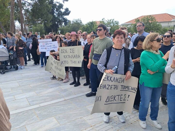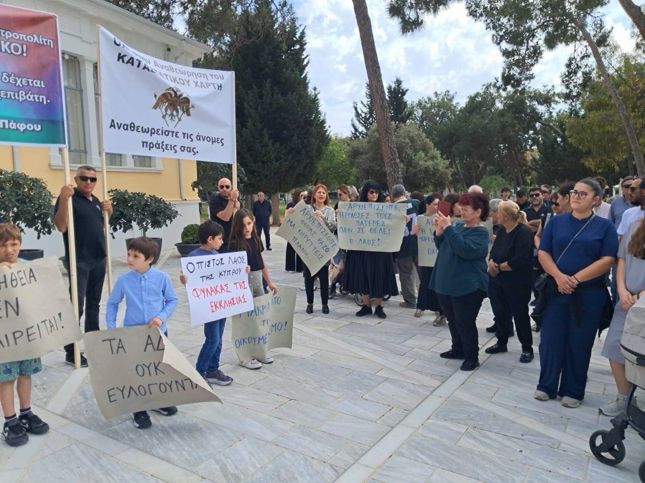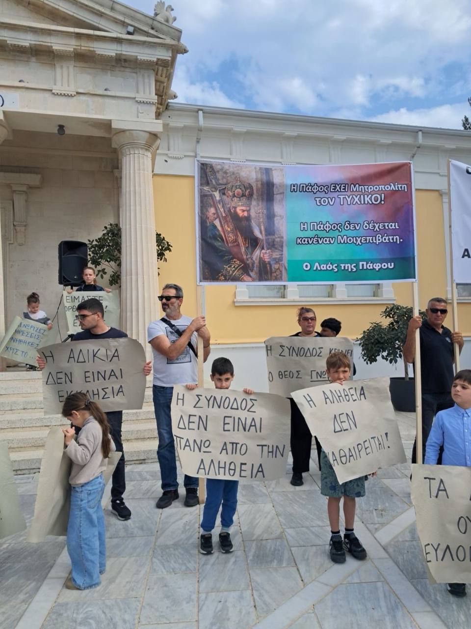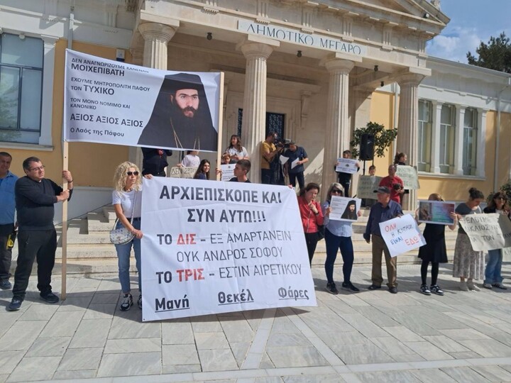 Σε εξέλιξη βρίσκεται η εκδήλωση διαμαρτυρίας ατόμων που υποστηρίζουν τον τέως Μητροπολίτη Πάφου Τυχικό. Αρκετοί έχουν συγκεντρωθεί στην Πλατεία του Δημαρχείου της Πάφου κρατώντας πανό με συνθήματα υπέρ του τέως Μητροπολίτη το αναφέρει cyprustimes.